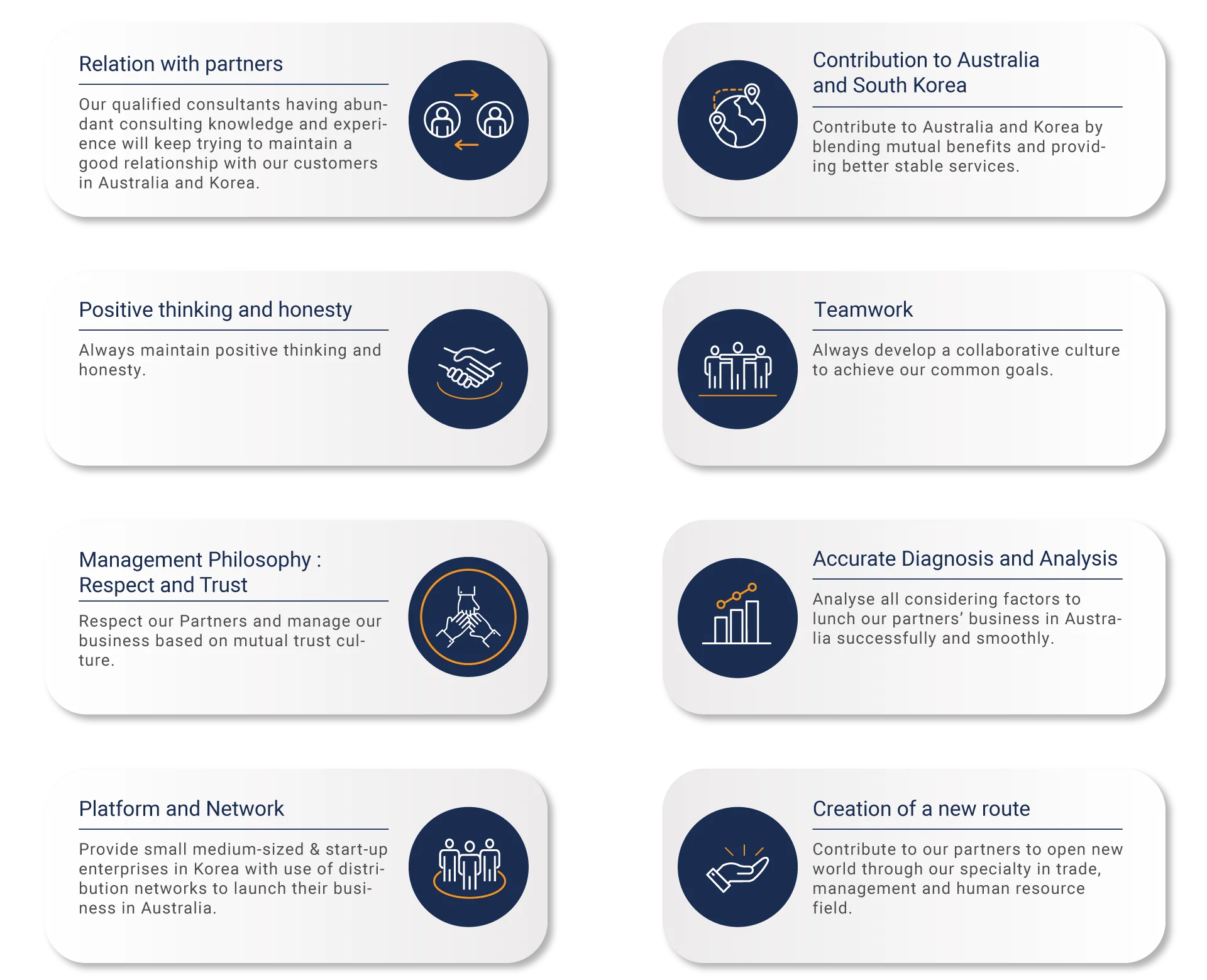 We provide various services to businesses seeking opportunists to present in Australia including market research, business partner search, due diligence, strategic planning, business set-up and local representation and offshore investment advice.